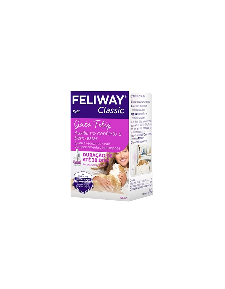 Feliway Classic é um análogo sintético do odor facial felino (F3) que auxilia na adaptação de gatos adultos e filhotes em situações adversas do dia a dia: mudança do ambiente, chegada de novos membros da família (novo animal ou bebê), transporte, ambientes desconhecidos (clínica veterinária) e outras situações como ruídos altos (fogos de artifícios, festas, eventos), adoção, gatil ou hotel.