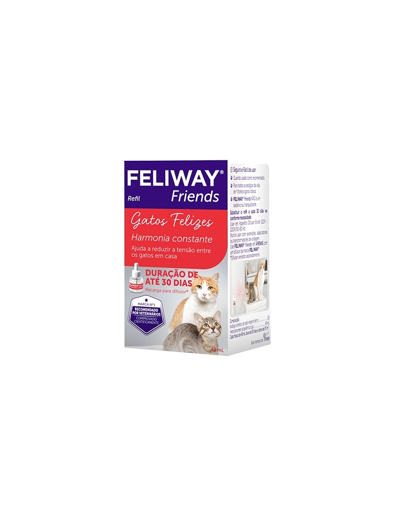 Feliway Friends é um análogo sintético do odor materno felino que ajuda na convivência harmônica, por diminuir a frequência e intensidade dos conflitos entre os gatos que vivem juntos.
