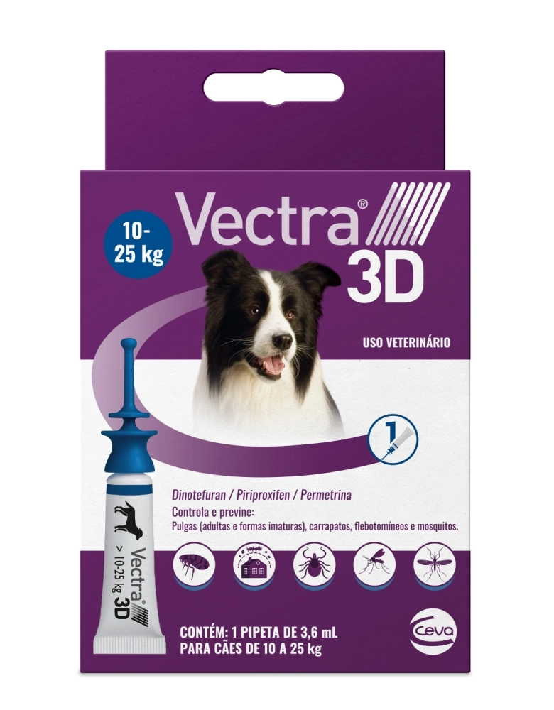 Vectra 3D é um antiparasitário tópico a base de permetrina, dinotefuran e piriproxifen para combate e controle de pulgas (adultas e imaturas), carrapatos, flebótomos (transmissores da Leishmaniose) e mosquitos (transmissores da Dirofilariose) em cães.
