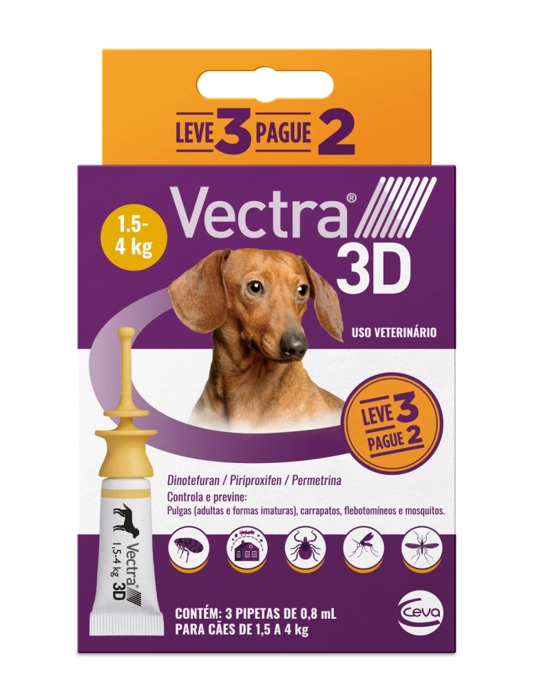 Combo Leve 3 Pague 2 Antipulgas, Carrapatos e Repelente Ceva Vectra 3D para Cães de 1,5 a 4 Kg 0,8 ml