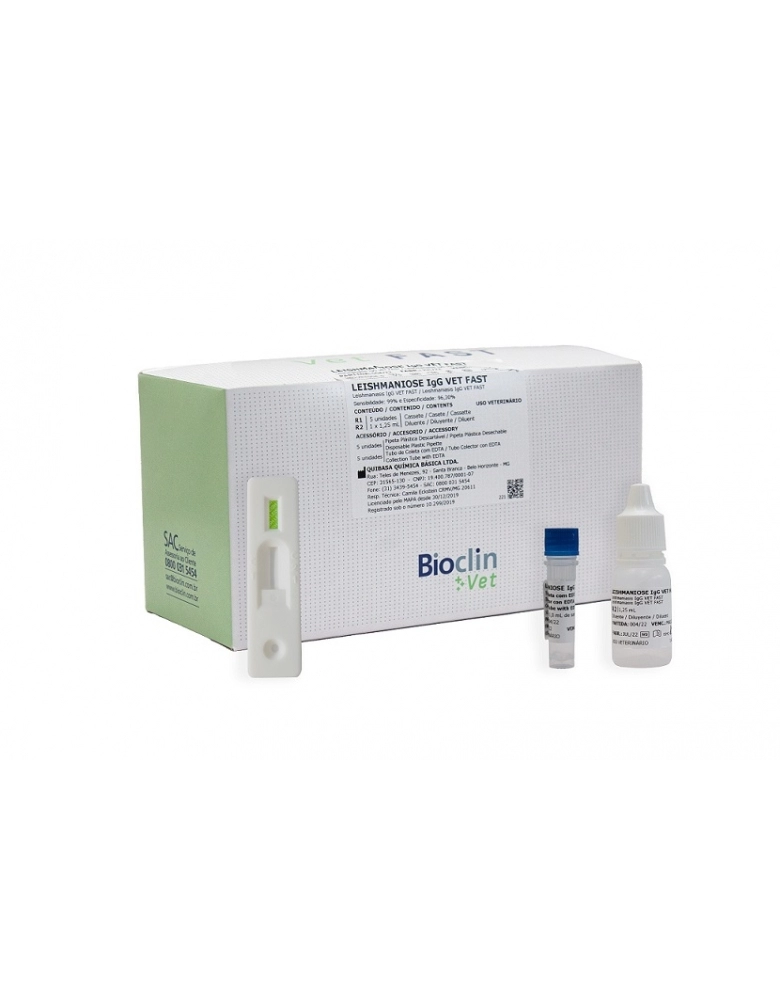 Teste imunocromatográfico (teste rápido) qualitativo para detecção de anticorpos IgG contra Leishmania infantum em amostras de sangue, soro ou plasma.